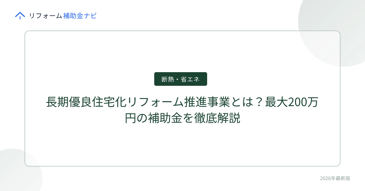 長期優良住宅化リフォーム推進事業は、耐震・省エネ・劣化対策を組み合わせた総合リフォームに最大200万円が補助される、非常に手厚い国の制度です。