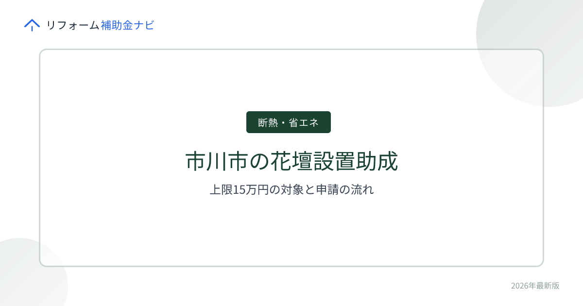 本記事はリフォーム補助金ナビDB(id=25120019)登録の一次データおよび公式公表情報をもとに、執筆時点の内容を整理したものです。助成額・対象条件・受付状況は年度や予算進捗により変更される場合があります。実際の申請にあたっては、必ず公益財団法人市川市花と緑のまちづくり財団の最新案内を確認し、ご不明点は同財団までお問い合わせください。本記事の情報により生じた損害について、当サイトは一切の責任を負いかねます。