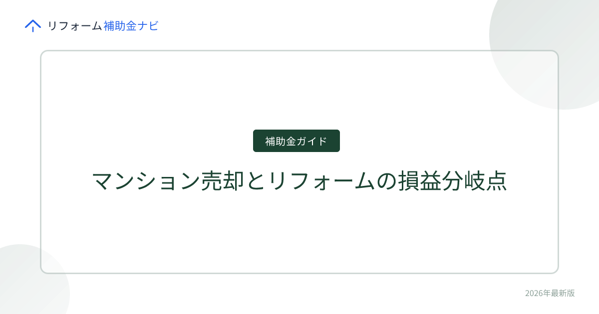 リフォーム費用が売却額の14%に収まるため、リフォームが有利な典型例です。築25年はマンション価格が底値圏に近づく時期でもあり、ここでリフォームすれば「安く買って直す」のと同じ効果が得られます。さらに補助金を活用すれば、実質負担を数十万円単位で下げられる場合があります。