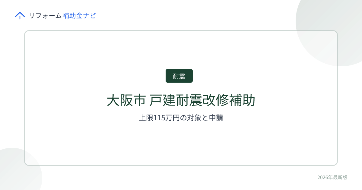 大阪市は、旧耐震基準で建てられた戸建住宅の耐震改修費を最大で1棟あたり百万円超の単位で補助する制度を運用しています。本記事は リフォーム補助金ナビDB登録の本制度(区分: 大阪市 / 工事種別: 耐震) を一次ソースで再確認したうえで、「自分の家が対象になるのか」「いくら戻ってくる目安なのか」「いつまでに何をすべきか」を読み手の意思決定順に整理した実務ガイドです。