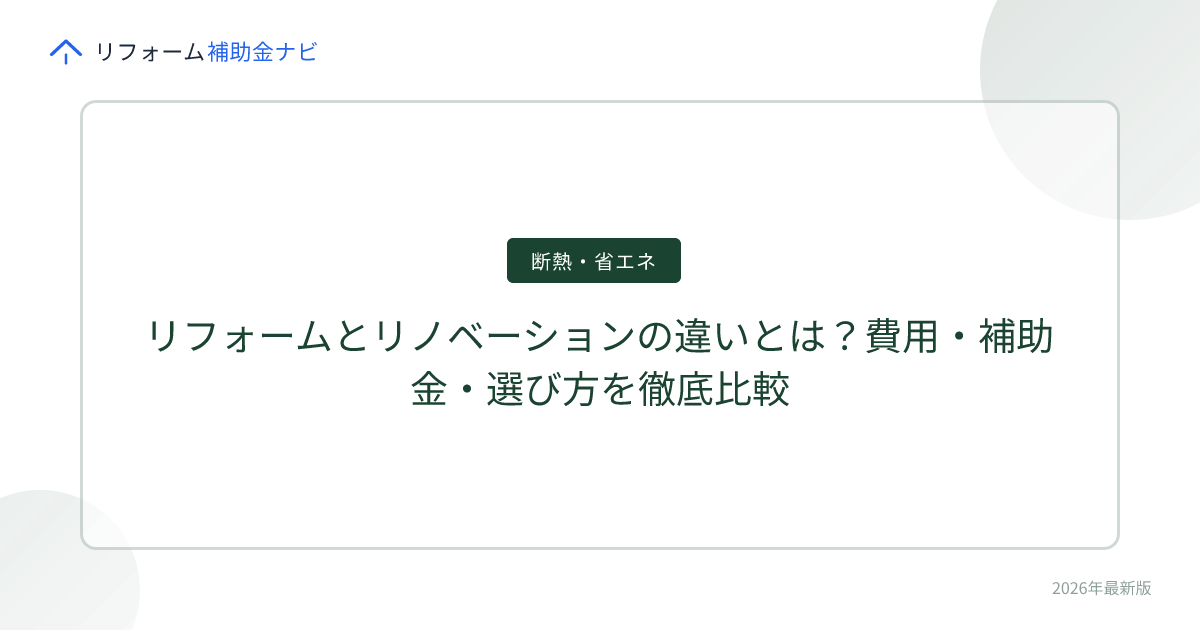 「リフォームとリノベーション、何が違うの?」——この疑問、リフォームを検討する方の多くが最初に抱きます。結論から言うと、リフォームは「原状回復」、リノベーションは「価値向上」。そして補助金が使いやすいのは圧倒的にリフォーム側です。